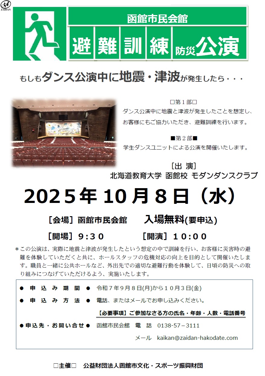コンサート中に発生した災害を想定した避難を体験してみませんか? 避難訓練終了後は地元で活動されている学生ダンスユニット、北海道教育大学 函館校 モダンダンスクラブの公演をお楽しみいただけます。 事前のお申込みが必要となりますのでご注意ください。